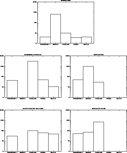 I should emphasize that all these results are only obtained from particular implementations of these algorithms. In particular the GENEsYs package [Bäck and Hoffmeister, 1992] was used for the genetic algorithms, the ASA package [Ingber, 1993] was used for simulated annealing, and the programs from ``Numerical Recipes in C'' [Press et al., 1992] were used for implementations of Powell's method and downhill simplex. Other implementations, or other parameter settings may give different results. Furthermore, the topic of optimization has a vast literature. I discovered that the M.I.T. library has 1240 volumes on the subject, when I tried to do a literature search. Thus it was impossible to run comparison tests with all known methods. Instead I compared my program to a subset of well known, widely used methods.