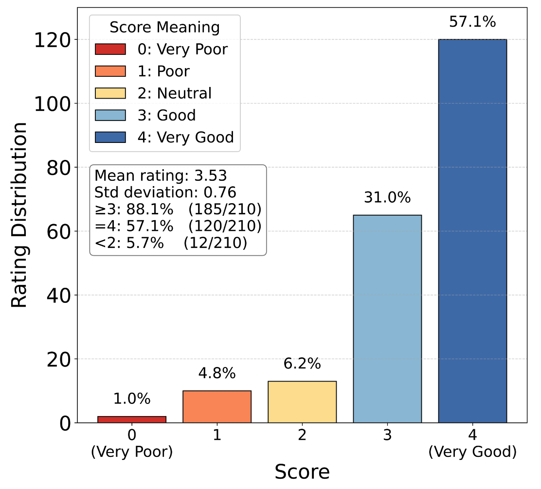 User study results of fluid-character interactions. Most ratings were positive, with 88.1% ≥ 3 (Good + Very Good) and 57.1% rated as 4 (Very Good). The mean score was 3.53 (std: 0.76), indicating strong perceived realism.