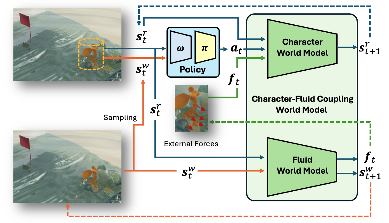 An overview of the Character-Fluid Coupling World Model, a two-level framework. The Character World Model predicts the next character state (blue lines) based on the previous character states, external forces, and policy-driven actions. The Fluid World Model takes the states of both the fluid and the character to compute external forces on the character and predict the fluid's next state (orange lines). External forces serve as the interface connecting the two models (green lines). The dashed line represents state updates.