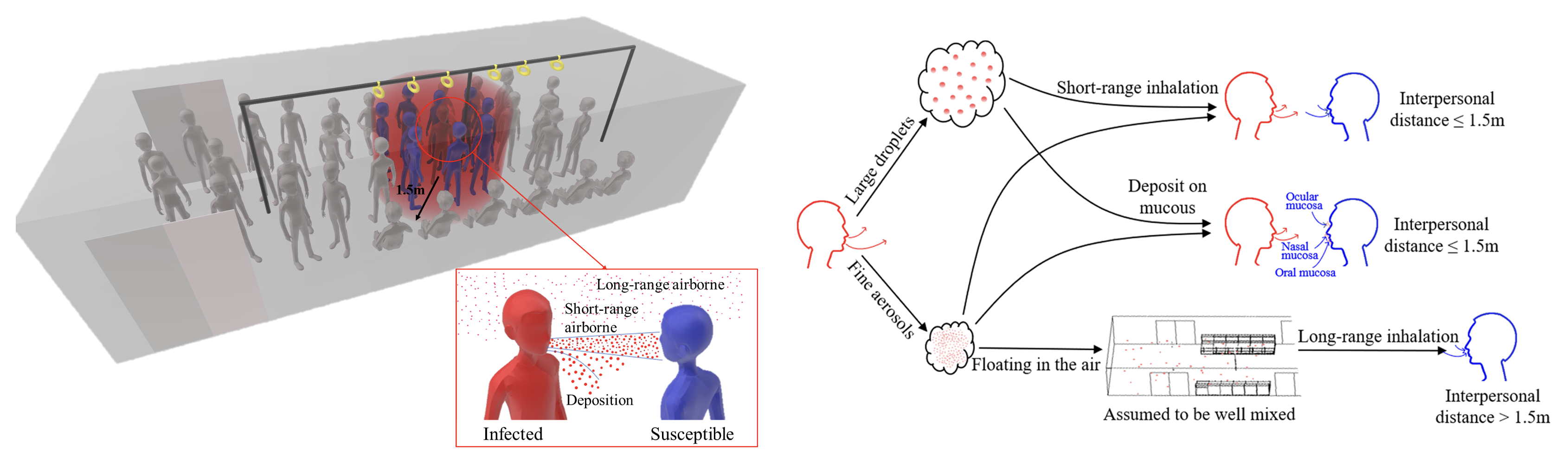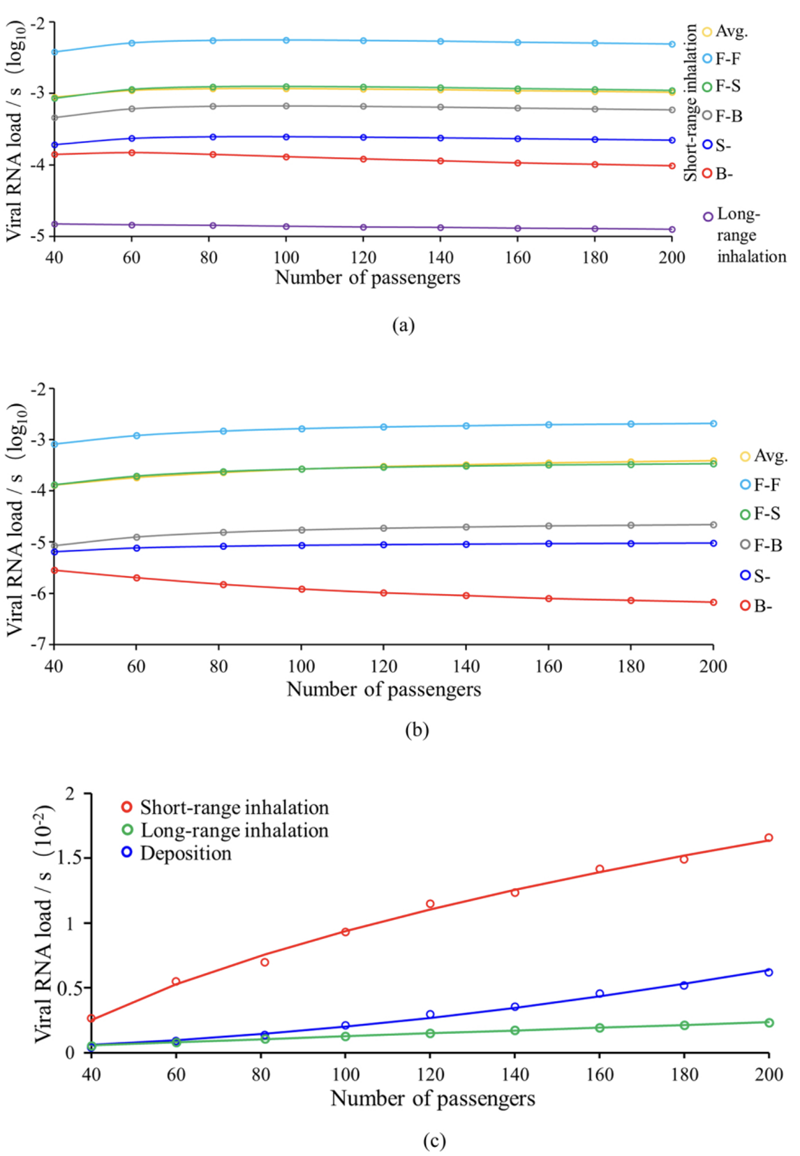 Face-to-face position resulted in the highest personal virus exposure, followed by face-to-side, face-to-back, side of the infected, and back of the infected. The virus exposure is highest through short-range inhalation, which is 3.2 and 7.5 times higher than deposition and long-range inhalation during the rush hour, respectively, and 5.6 and 3.7 times higher than deposition and long-range inhalation during the non-rush hour, respectively. The personal virus exposure through short-range inhalation, long-range inhalation, and deposition during the rush hour were 1.7, 0.9, and 2.6 times higher than during the non-rush hour, respectively. Short-range inhalation was the most sensitive to the number of passengers, while long-range inhalation was the least sensitive. During rush hour, the total exposure via short-range inhalation, long-range inhalation, and deposition were 7.1, 3.5 and 12.4 times higher than during the non-rush hour.