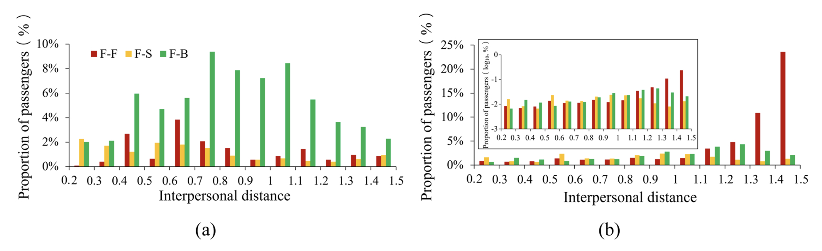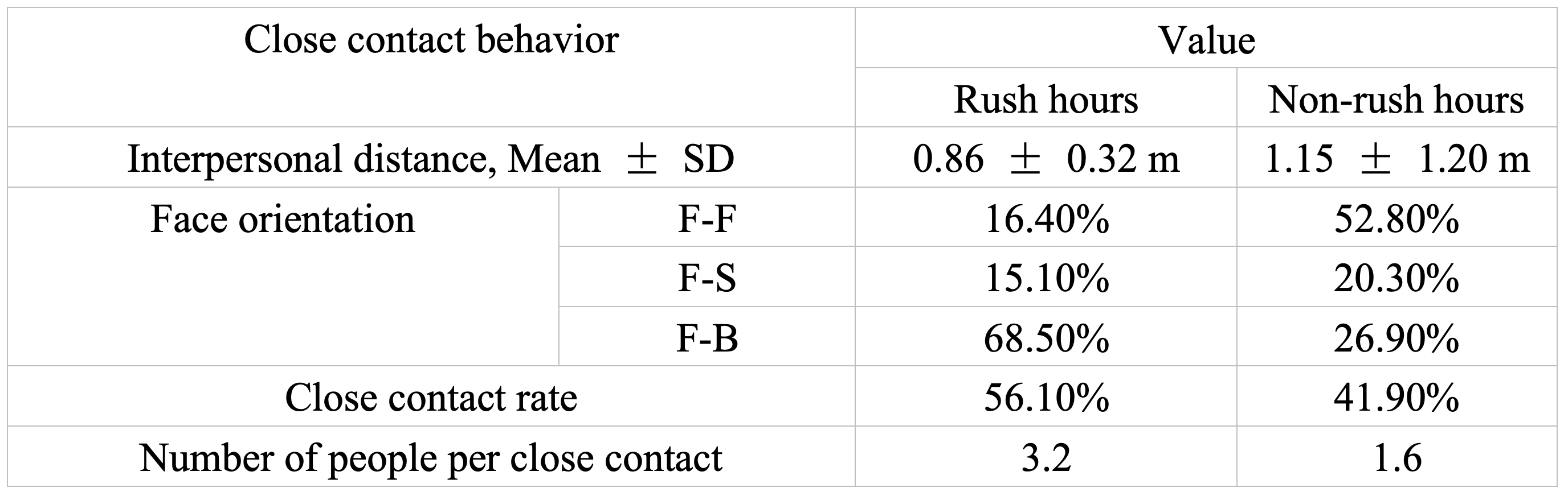 A total of 53,487 data points of close contact behavior during non-rush hour, and 92,334 during rush hour, were obtained. We calculated the probability distribution of interpersonal distance and face orientation based on all the obtained data. The average interpersonal distance was 0.8 m and 1.1 m during rush and non-rush hour periods, respectively. The close contact rate during rush and non-rush hour periods were 56.1 % and 41.9 %, respectively. The number of people per close contact was 3.2 during rush hour and 1.6 during non-rush hour. For all close contacts, during rush hour, face-to-face (F-F), face-to-side (F-S), and face-to-back (F-B) patterns accounted for 16.4 %, 15.1 %, and 68.5 %, respectively; during non-rush hour, F-F, F-S, and F-B accounted for 52.8 %, 20.3 %, and 26.9 %, respectively. All close contact behavior data are shown in Table .