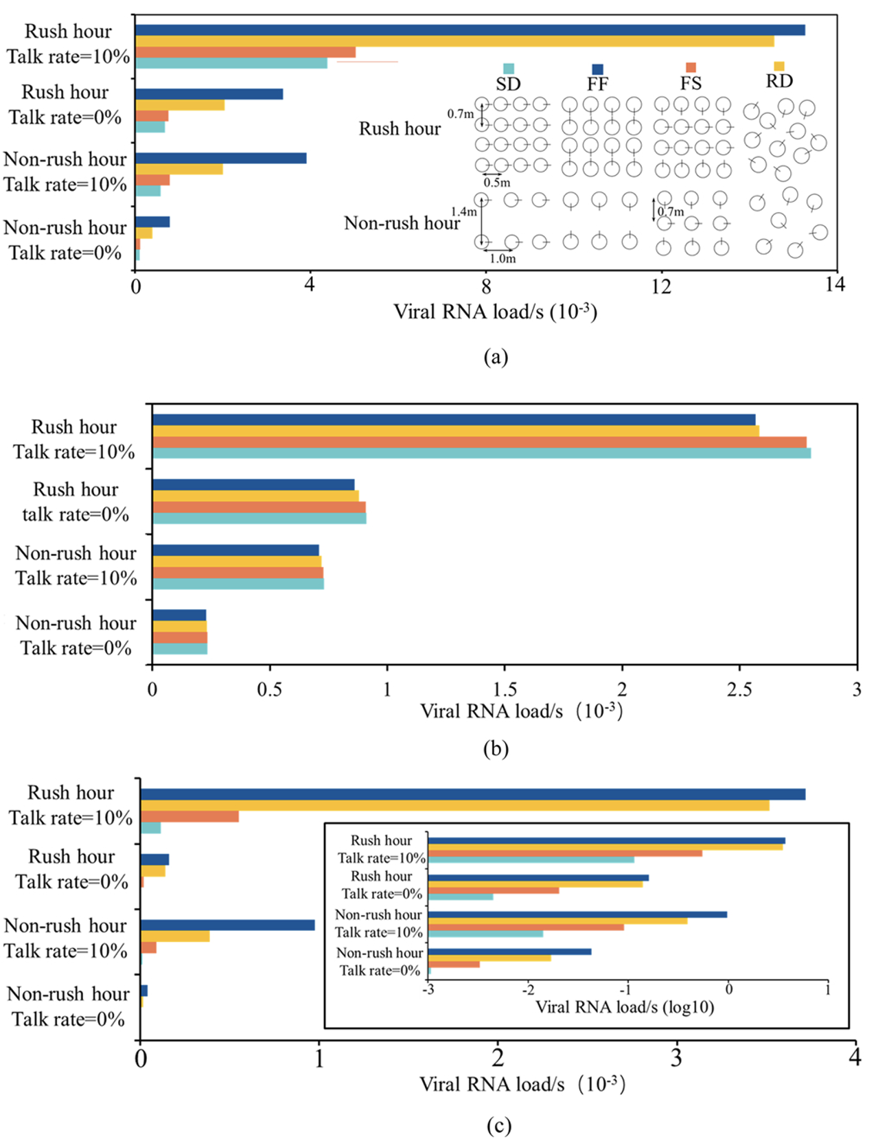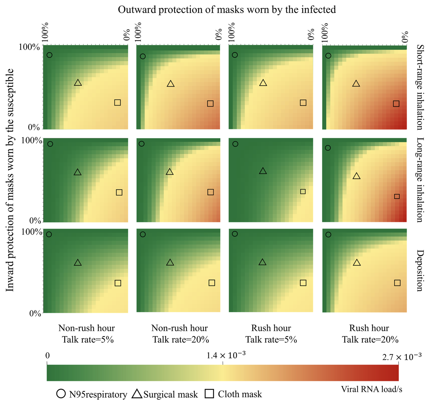 During rush hour, when the talk rate is 50 %, the personal virus exposure for short-range inhalation and deposition was 31.6 and 159.8 times higher than those when the talk rate is 0 %, respectively. For long-range inhalation, the personal virus velocity during rush hour was 10.2 times higher than that during non-rush hour. Compared to the no-talk condition, when the talk rate is 20 %, the personal virus exposure and total exposure for short-range inhalation, long-range inhalation, and deposition were 1.7, 0.9, 2.7 times during rush hour, and 8.0, 3.4, 12.6 times during non-rush hour, respectively.