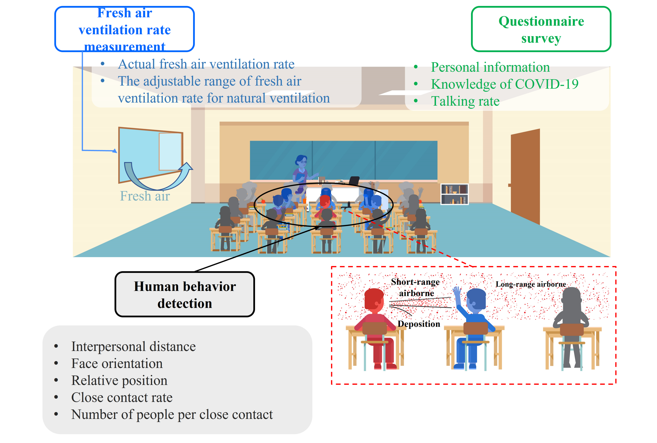 In this paper, we developed a wearable device for close contact behavior detection and recorded more than 250-thousand data points of close contact behaviors of students from Grades 1 through 12. Combined with a survey on students’ behaviors, virus transmission characteristics in classrooms was analyzed. We found that close contact rates for students were `37%\pm11%` during classes and `48%\pm13%` during breaks. Students in lower grades had higher close contact rates and virus transmission potential. The long-range airborne transmission route is dominant, accounting for `90%\pm3.6%` and `75%\pm7.7%` with and without mask wearing, respectively. During breaks, the short-range airborne route became more important, contributing `48%\pm3.1%` in grades 1 to 9 (without wearing masks). Our proposed human behavior detection and analysis methods offer a powerful tool to understand virus transmission characteristics, and can be employed in various indoor environments.