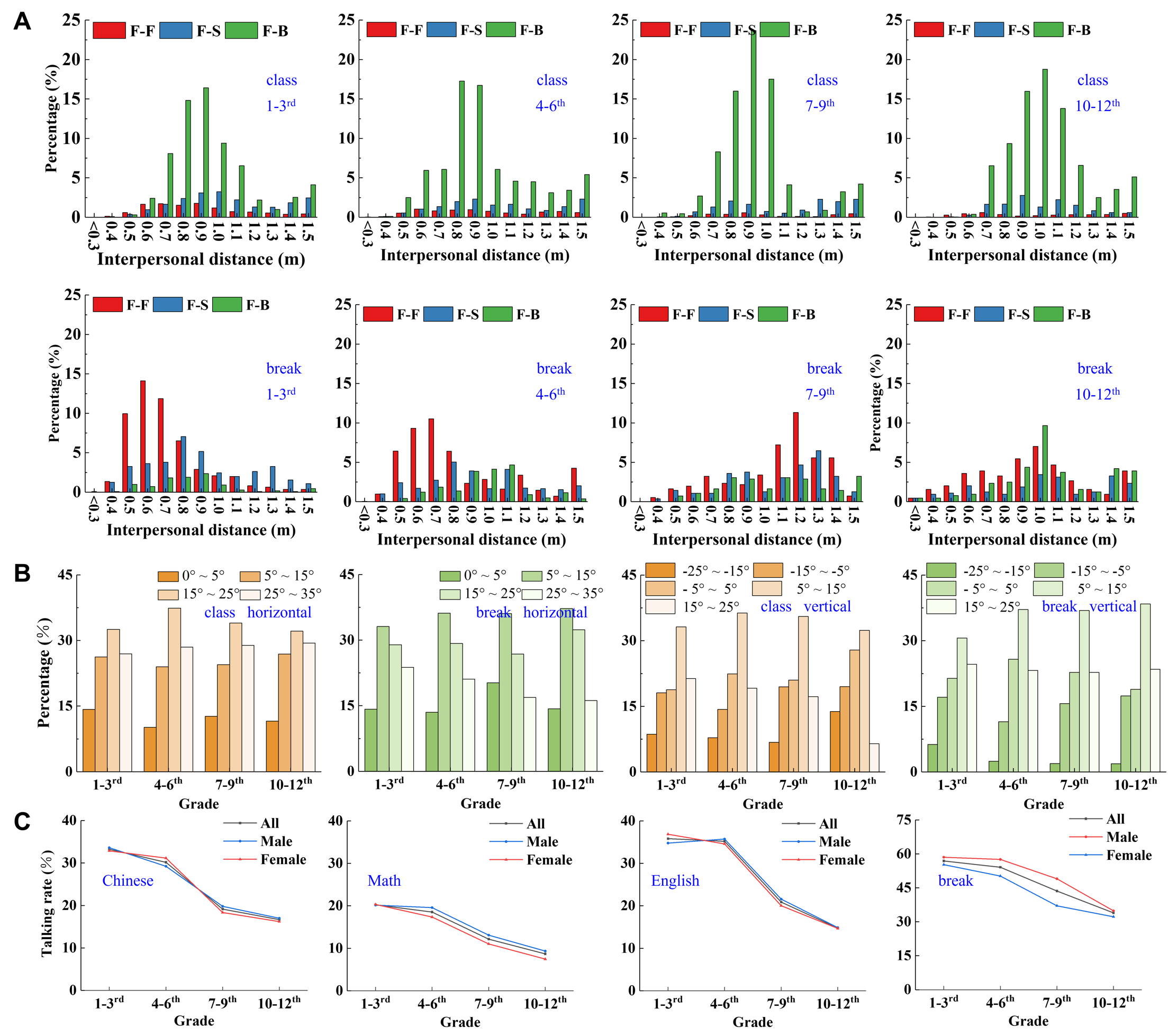 During classes, face-to-back is the main orientation for close contacts because students usually face the blackboard and teacher. The probability of face-to-back close contact increases with grade level. During breaks, face-to-face was dominant. The absolute horizontal relative angles were usually concentrated between `5°~35°` during classes and `15°~25°` was the dominant relative angle range. During breaks, the absolute horizontal relative angles were usually concentrated between `5°~25°` and `5°~15°` was the dominant relative angle range. The vertical relative angle was usually concentrated between `-5°~25°` during both classes and breaks, with relatively few vertical angles being less than `-5°`. During breaks and classes, the talking rate generally decreased with increasing grade. English, Chinese, and Math class had average talking rates of `27%`, `25%`, and `15%`, respectively.
