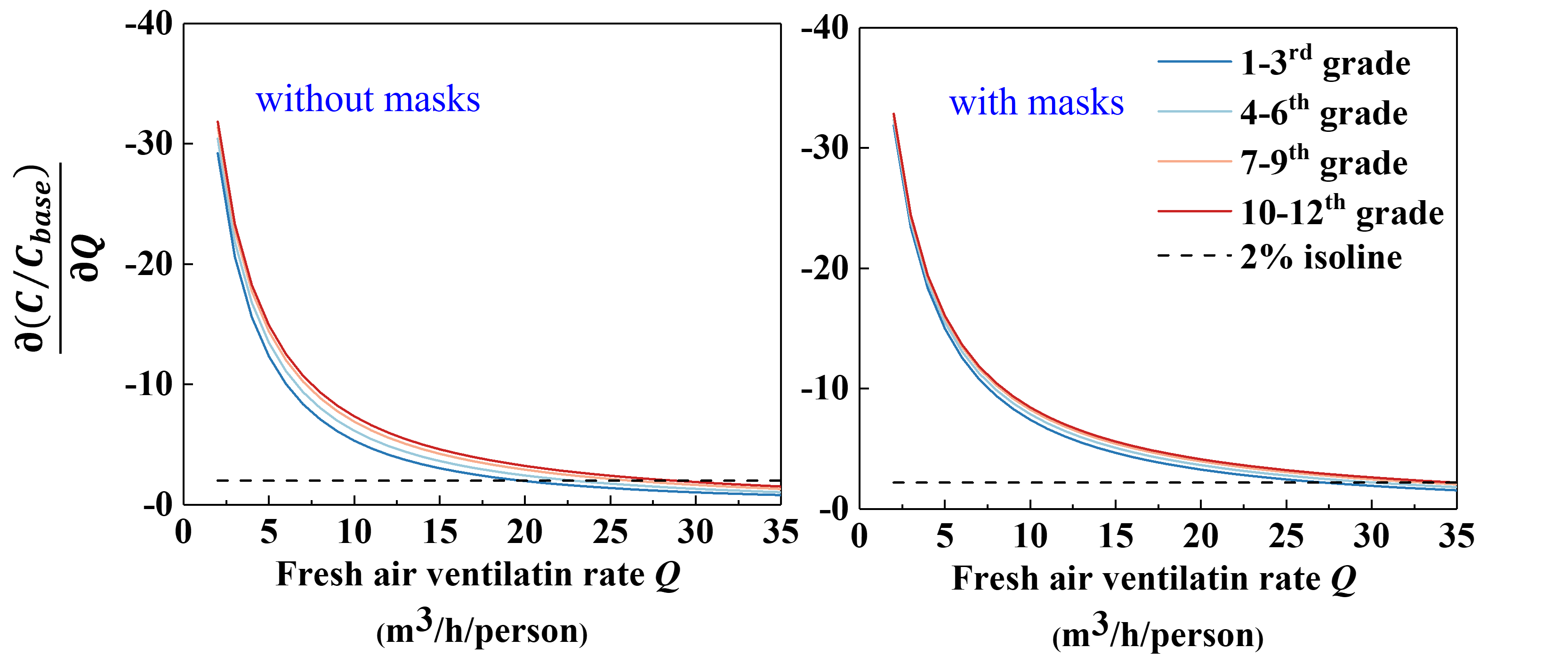 The relative infection risk declined with increasing outdoor air ventilation rate, but this trend gradually flattened out. The absolute value of `\frac{∂(C//C_{base})}{∂Q}` changed little (`≤2%`) when the outdoor air ventilation rate exceeded `30 m^3`/`h`/`person`. Above this point, continually increasing outdoor air does not reduce the infection risk effectively, but consumes more energy. Therefore, we suggested a `30 m^3`/`h`/`person` outdoor air ventilation rate in classrooms.