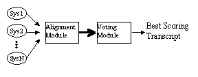 The ROVER system is implemented in two modules. First, the system outputs from two or more ASR systems are combined into a single word transition network. The network is created using a modification of the dynamic programming alignment protocol traditionally used by NIST to evaluate ASR technology. Once the network is generated, the second module evaluates each branching point using a voting scheme, which selects the best scoring word (with the highest number of votes) for the new transcription. Figure 1 shows the overall system architecture.