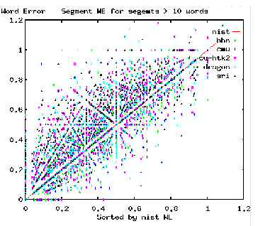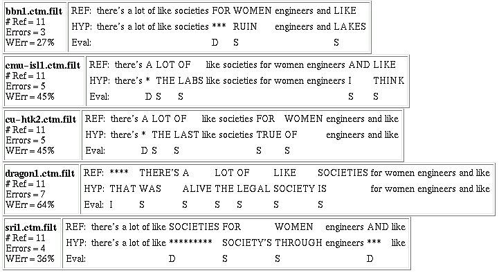 When we compare the errorful segments identified by the MAPSSWE test, we find that out of 5919 errorful segments, BBN had 738 segments in which only BBN output an error, and CMU-ISL had 755 segments in which only CMU-ISL output an error. An interpretation of these statistics is that there are almost 1500 errorful segments that could potentially be corrected. What is needed is a means to compare errors and implement a rescoring process to identify the correct words. In some cases, an implementation of a simple "voting" process can identify the correct word.