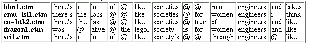 Figure 6 illustrates an output Composite WTN from aligning five ASR system outputs for one set of errorful segments from our test set. The table columns represent a correspondence set, each of which is independently considered during the voting process.