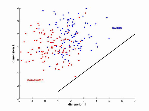 Each of the functions described in the previous section was a linear combination of the components of xt and used a specific set of weights in a parameter vector w. This parameter vector specifies the relevance of each component in the final score. Instead of relying on an arbitrary weight assignment, we would like to find an optimal w for each subject by using statistics obtained from their past actions. From a pattern classification perspective, we can accomplish this by using linear discriminant analysis (LDA) on the history vectors.
