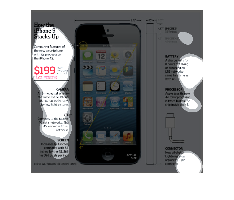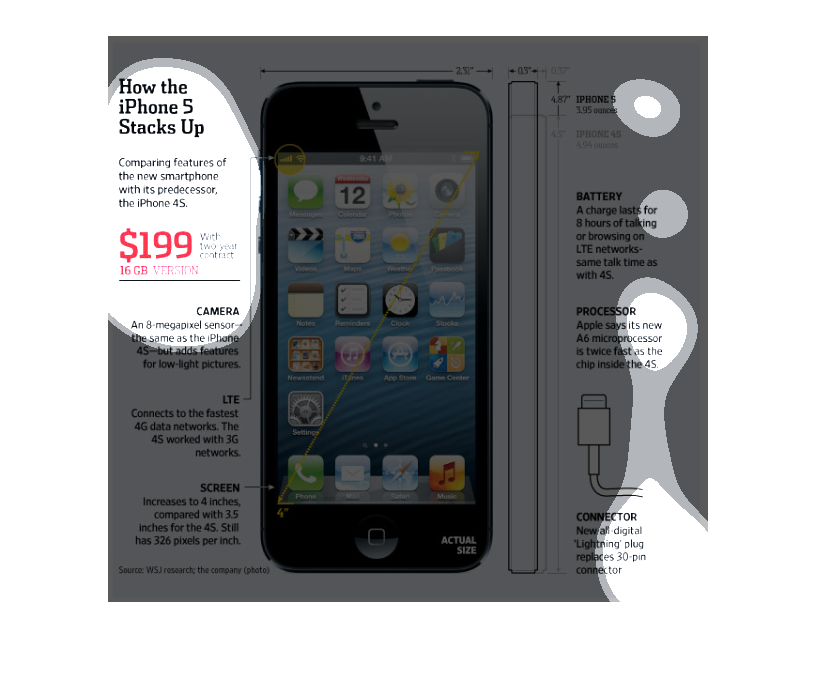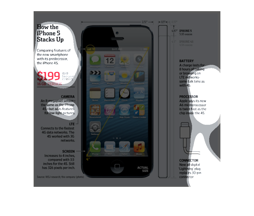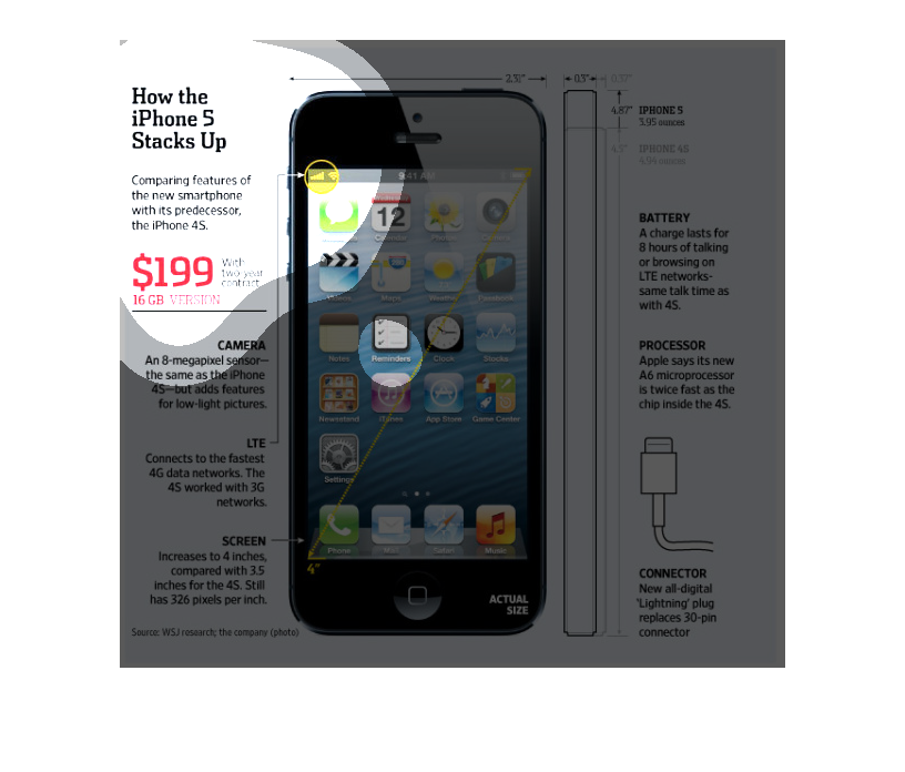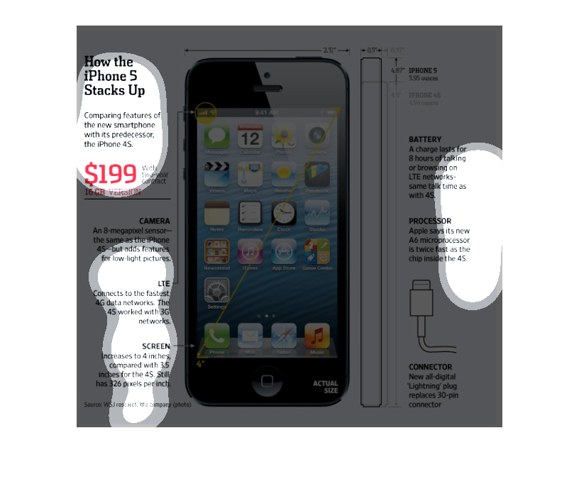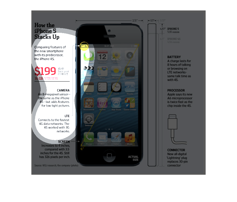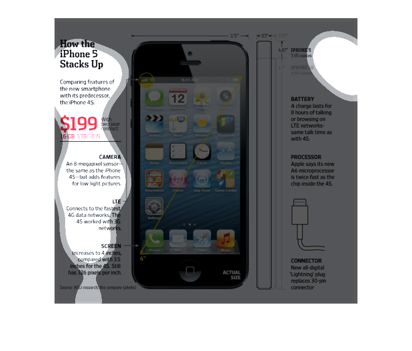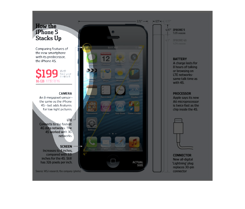 The image discusses and illustrates the new iPhone 5 in comparison to the iPhone 4S. The
