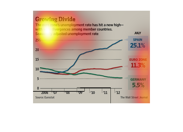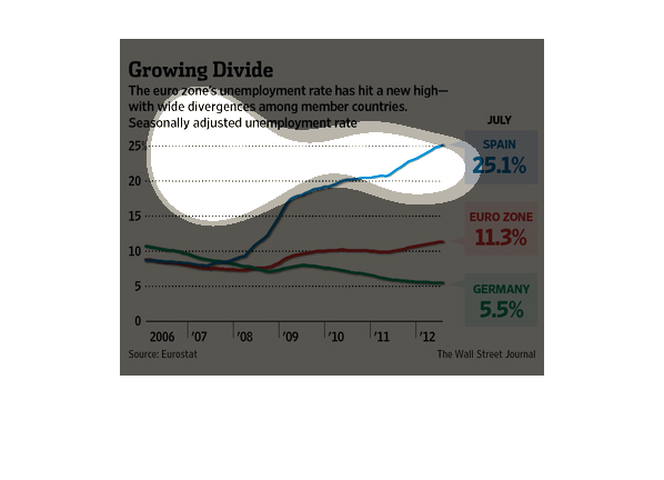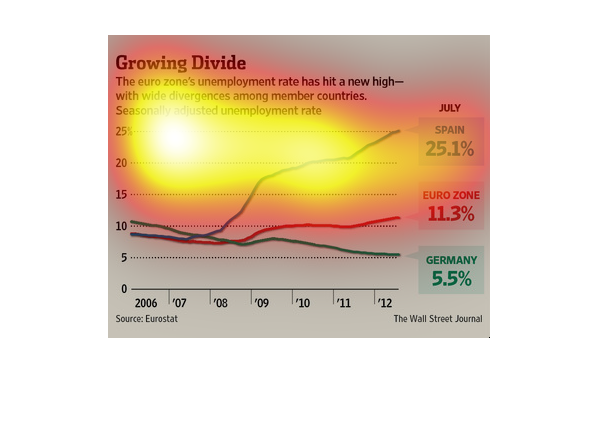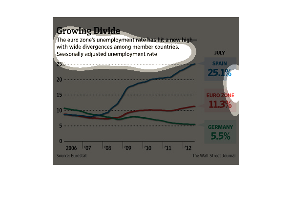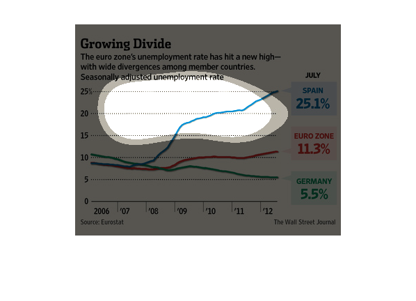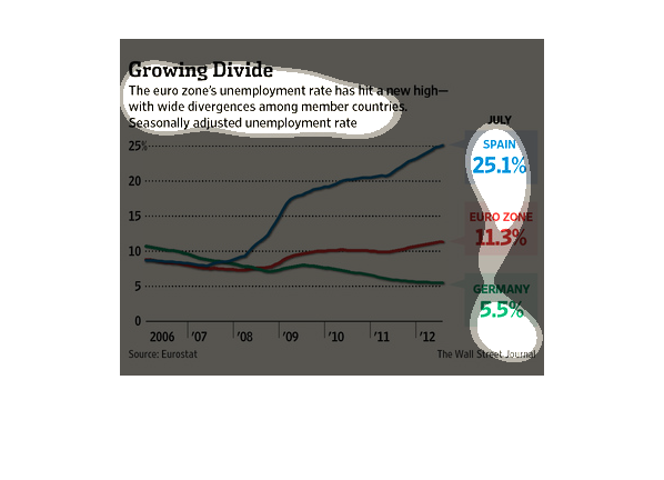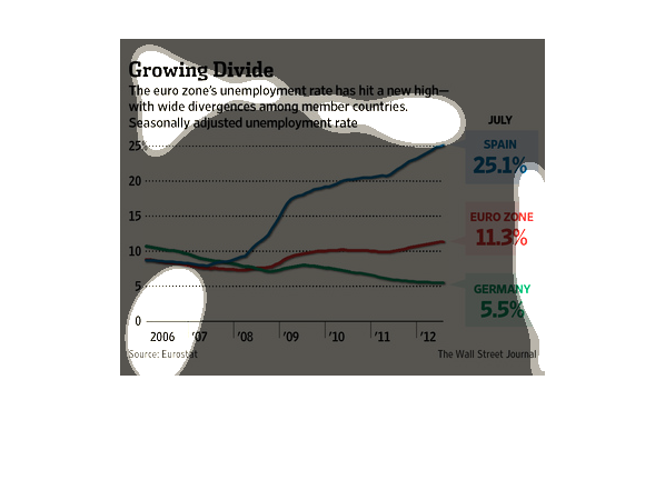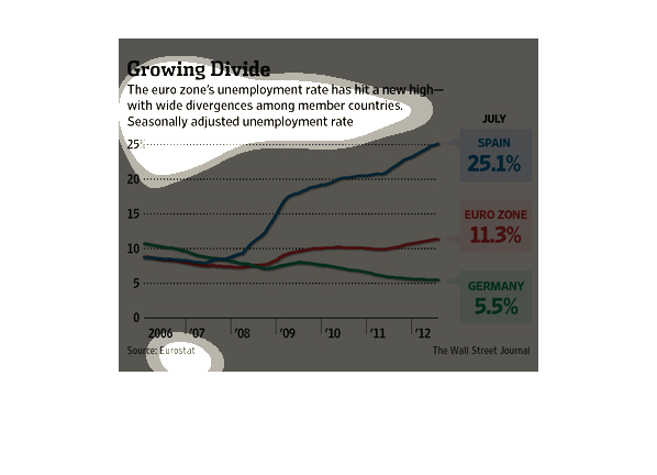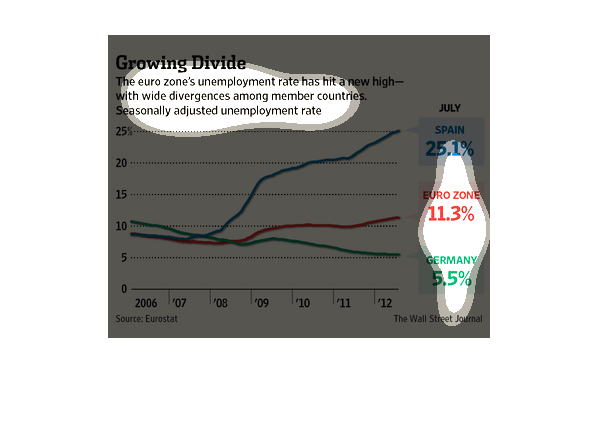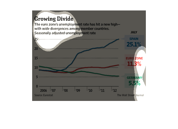 shows the change in unemployment from 2006 to 2012 for the Euro zone versus Spain and Germany.