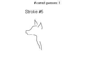 ans = Correct guesses: 26 (87% of all workers) ans = Incorrect guesses: 4 (13% of all workers) ans = No guesses made: 0 (0% of all workers) ans = Total # sketch strokes: 16 ans = Sketch stroke at which guessed: mean=6.07692, std=5.52031 (38% of whole sketch) ans = Number of guesses: mean=1.96667, std=1.03335
